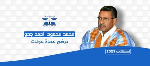 منذ إعلان حزب الإنصاف اختياره لرجل الاعمال ورائد العمل الخيري السيد محمد محمدو ولد أحمد جدو مرشحا لمنصب عمدة لمقاطعة عرفات . وهو الاختيار الذي أثلج صدور ساكنة مقاطعة عرفت في رجل الخير والفضل والتواضع من البذل والسخاء ما لم تعرفه في غيره من رجال أعمالها وفاعليها السياسين الكبار واطرها فلكل مواطن ومواطنة من ساكنة عرفات قصته الخاصة مع رائد العمل الخيري  ومواسى الضعفاءوالمحرومين محمد محمود ولد أحمد جدو مرشح حزب الإنصاف لمنصب العمدة في عرفات تجعله يتشبث بدعمه وينتظر بفارغ صبر اليوم الذي يقف فيه وحيدا  امام صناديق الاقتراع لتزكيته .