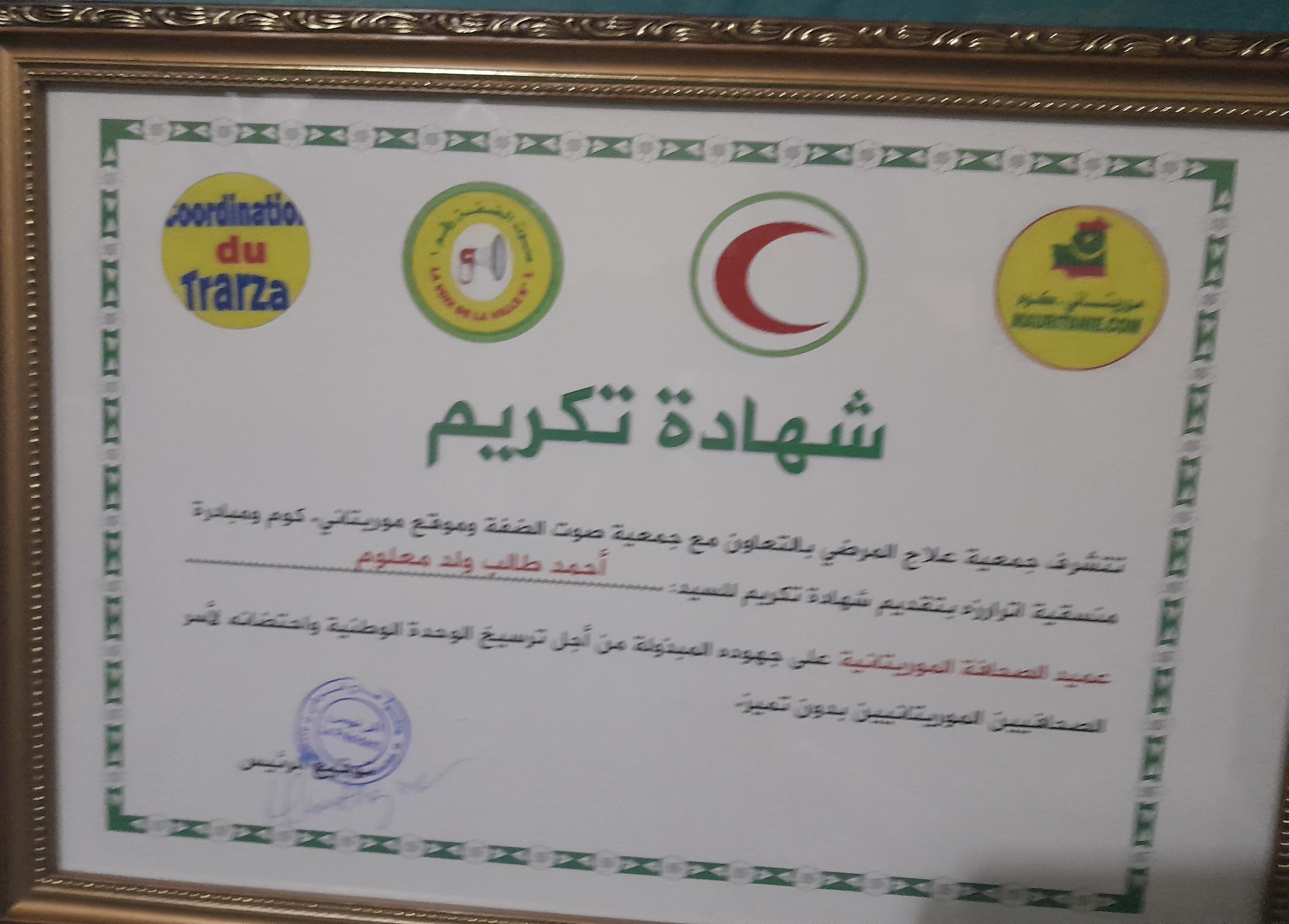 قدمت جمعيات، "صوت الضفة" و"علاج المرضى" و"مبادرة منسقية اترارزه" وموقع "موريتاني كوم" ،صباح يوم الاثنين بمقر نقابة الصحفيين الموريتانيين في نواكشوط، تكريما لنقيب الصحفيين الموريتانيين السيد أحمد طالب ولد المعلوم، تثمينا لما يبذله من جهود لصالح الصحفيين عموما وأسر الراحلين منهم خصوصا ولدوره الكبير في ترسيخ معاني الوحدة الوطنية وقيم المهنة الصحفية .
