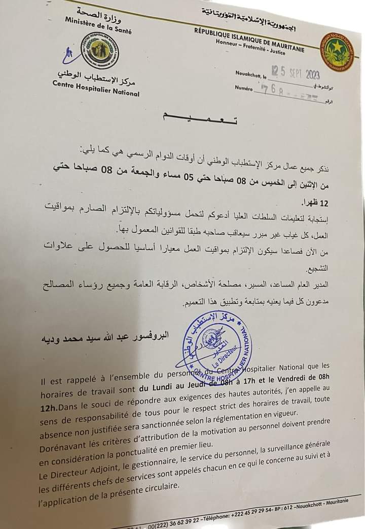 المدير العام للمستشفى الوطني يصدر تعميما حول أوقات الدوام الرسمي للعمال