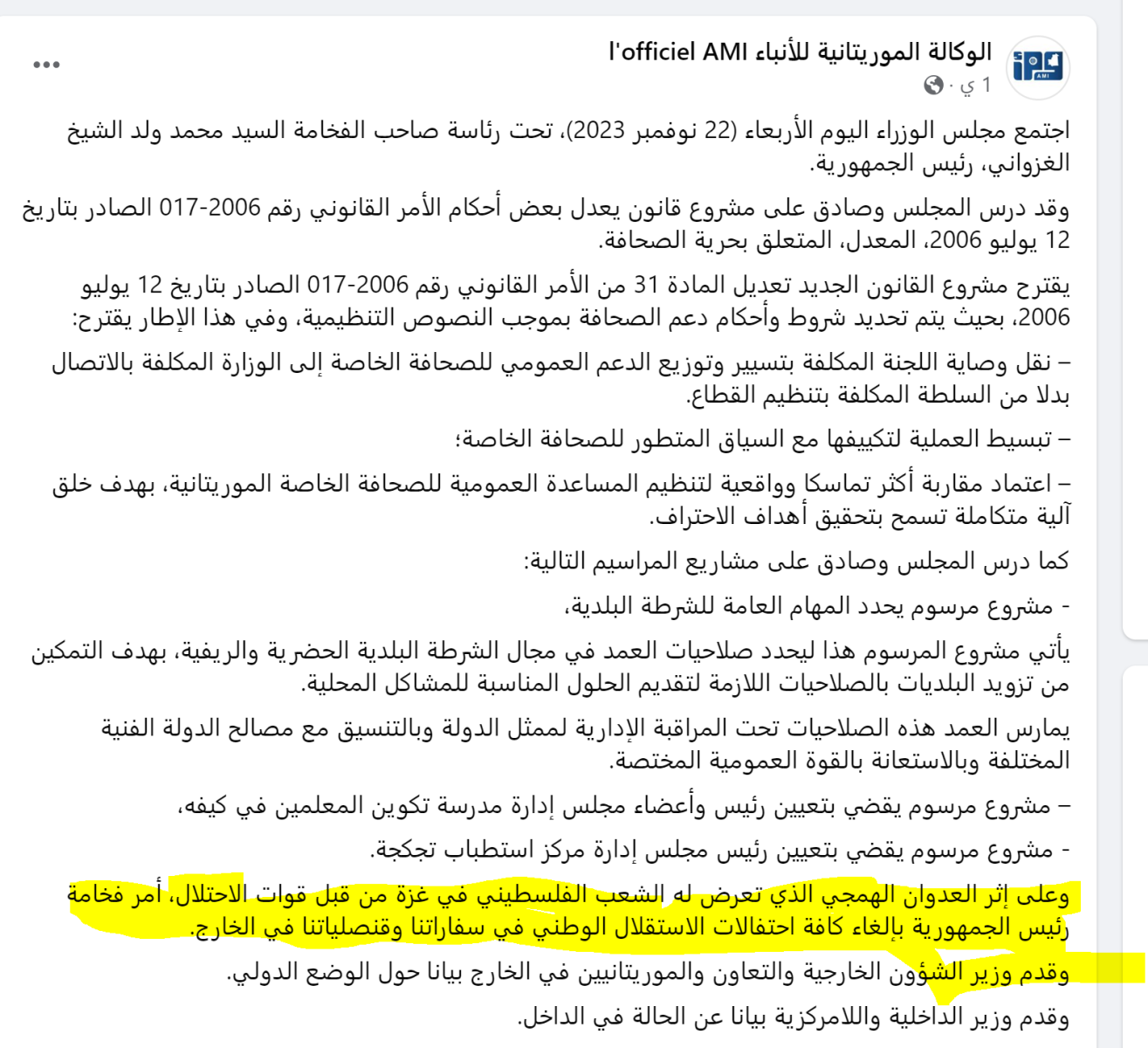 وبعدها تواصلنا مع الوالي المساعد ، ورد نفس الرد، وحين اتصلنا بالوالي الرئيسي السيد امربيه رب ولد عابدين قال بأن القرار اتخذوه استنادا إلى مضمون بيان مجلس الوزراء ـ والذي سنرفق الفقرة المتعلقة منه بتوقيف الأنشطة في هذا البيان ـ وأنه يحتاج وثيقة من الجهة الوصية أو مصدر البيان، (وزارة الثقافة ـ مدير ديوان رئيس الجمهورية ) ليكون استثناء من الأنشطة المرفوضة .
