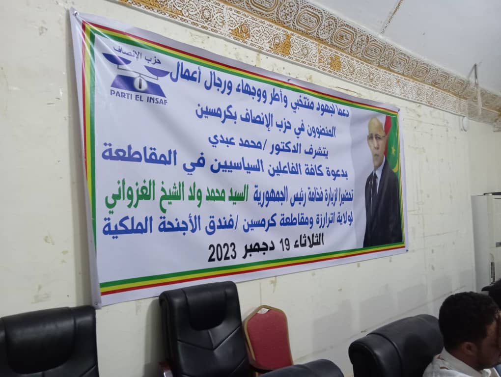 الوئام الوطني ـ نظم الدكتور محمد ولد عبدي مساء الثلاثاء 19-12-2023 في فندق الأجنحة الملكية بنواكشوط تظاهرة سياسية حاشدة تحضيرا لإنجاح زيارة رئيس الجمهورية لولاية اترارزة المرتقبة يوم الجمعة القادم.