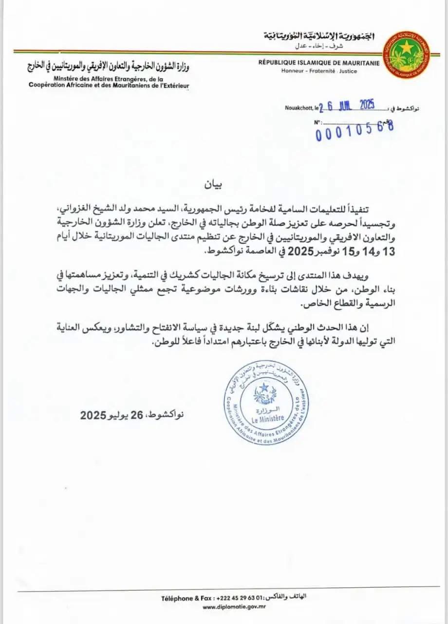 أعلنت وزارة الشؤون الخارجية والتعاون الإفريقي والموريتانيين في الخارج عن تنظيم منتدى الجاليات الموريتانية في الخارج في الفترة من 13 إلى 15 نوفمبر 2025، وذلك في العاصمة نواكشوط.