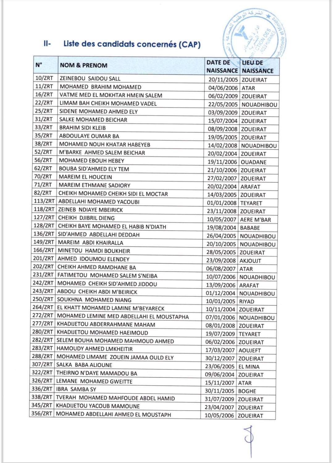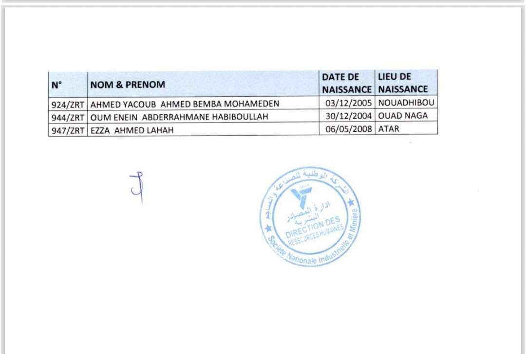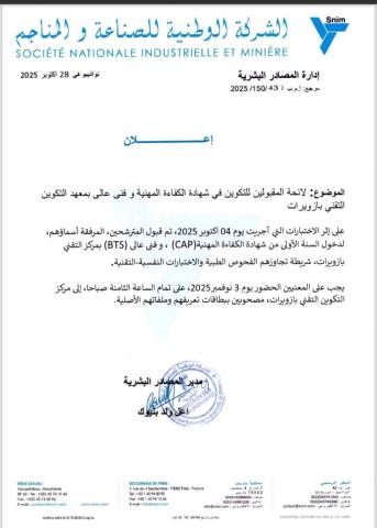 أصدرت إدارة المصادر البشرية بالشركة الوطنية للصناعة والمناجم (سنيم)، مساء اليوم الثلثاء،  لائحة بأسماء  المقبولين  للتكوين في شهادة الكفاءة المهنية (Cap) و فني عالٍ (BTS) بمعهد التكوين التقني بازويرات