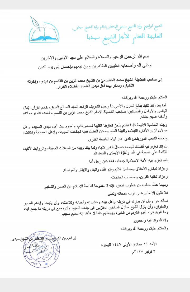 بعث الخليفة العام لأهل الشيخ سيدي، الشيخ إبراهيم ولد الشيخ سيدي المختار ولد الشيخ سيدي، رسالة تعزية إلى أسرة أهل الشيخ محمد الزين بن القاسم بن ديدي، في وفاة العالم الزاهد، الشيخ محمد الزين، الذي وافته المنية مؤخراً.