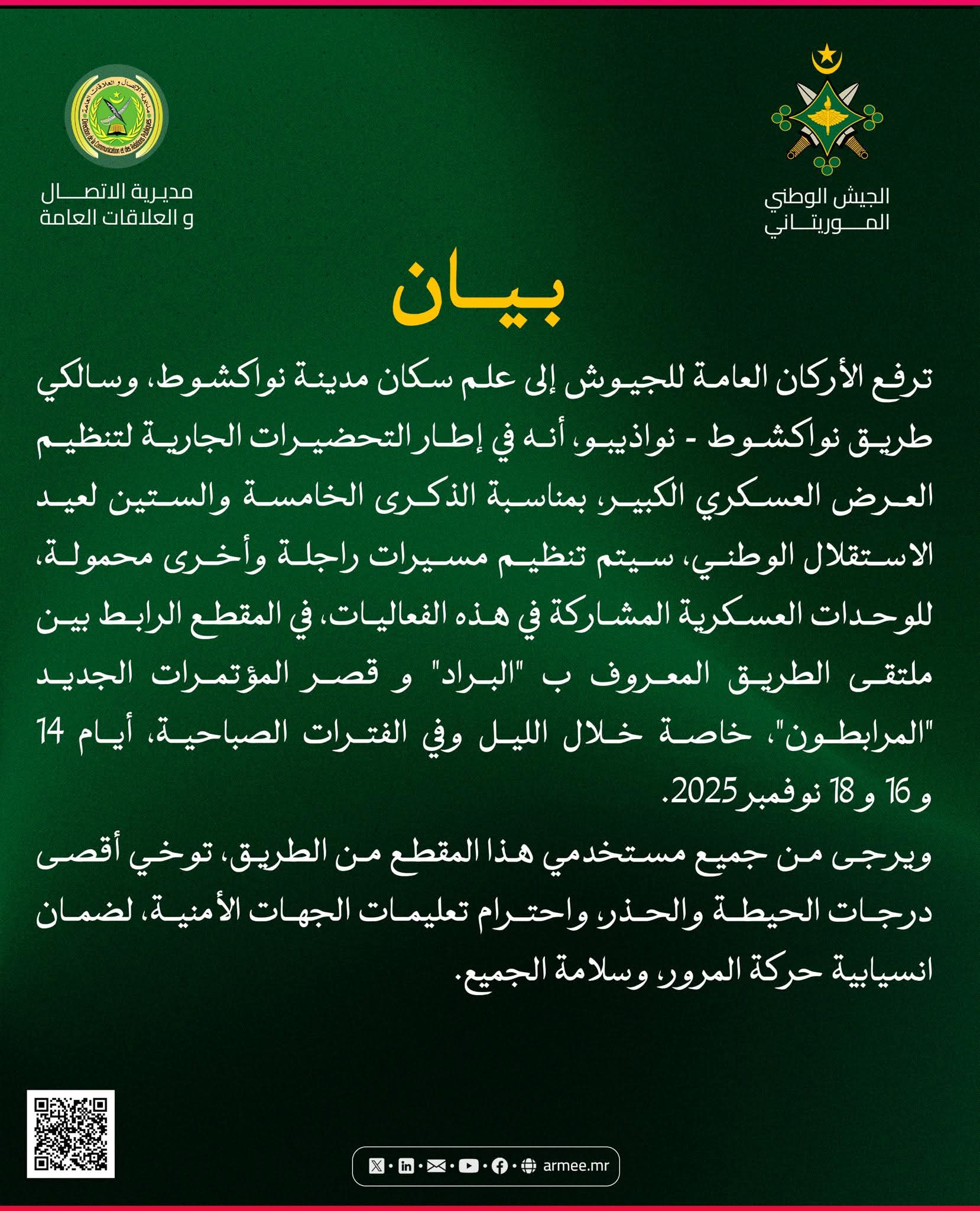 ترفع الأركان العامة للجيوش إلى علم سكان مدينة نواكشوط، وسالكي طريق نواكشوط - نواذيبو أنه في إطار التحضيرات الجارية لتنظيم العرض العسكري الكبير، بمناسبة الذكرى الخامسة والستين لعيـد الاستقلال الوطني، سيتم تنظيم مسيرات راجلة وأخرى محمولة للوحدات العسكرية المشاركة في هذه الفعاليات، في المقطع الرابط بين ملتقى الطريق المعروف ب "البراد" و قصر المؤتمرات الجديد "المرابطون"، خاصة خلال الليل وفي الفترات الصباحية، أيام 14 2025 و 16 و 18 نوفمبر
