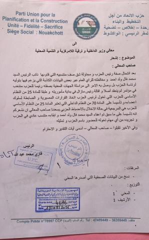 أعلن حزب الاتحاد من أجل التخطيط والبناء (UPC) عن إقالة نائب رئيسه محمد فال ولد أحمد من صفوفه وتجريده من جميع المهام التي تخوّله تمثيل الحزب أو الحضور باسمه، معتبرًا أنه أصبح “منتسبًا عاديًا”.