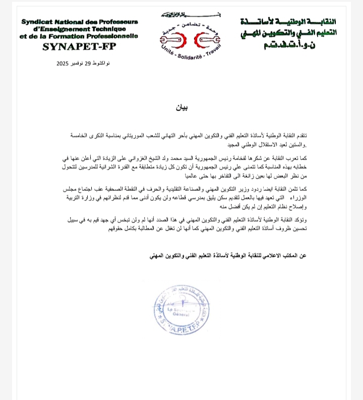 النقابة الوطنية لأساتذة التعليم الفني والتكوين المهني ـ بيان