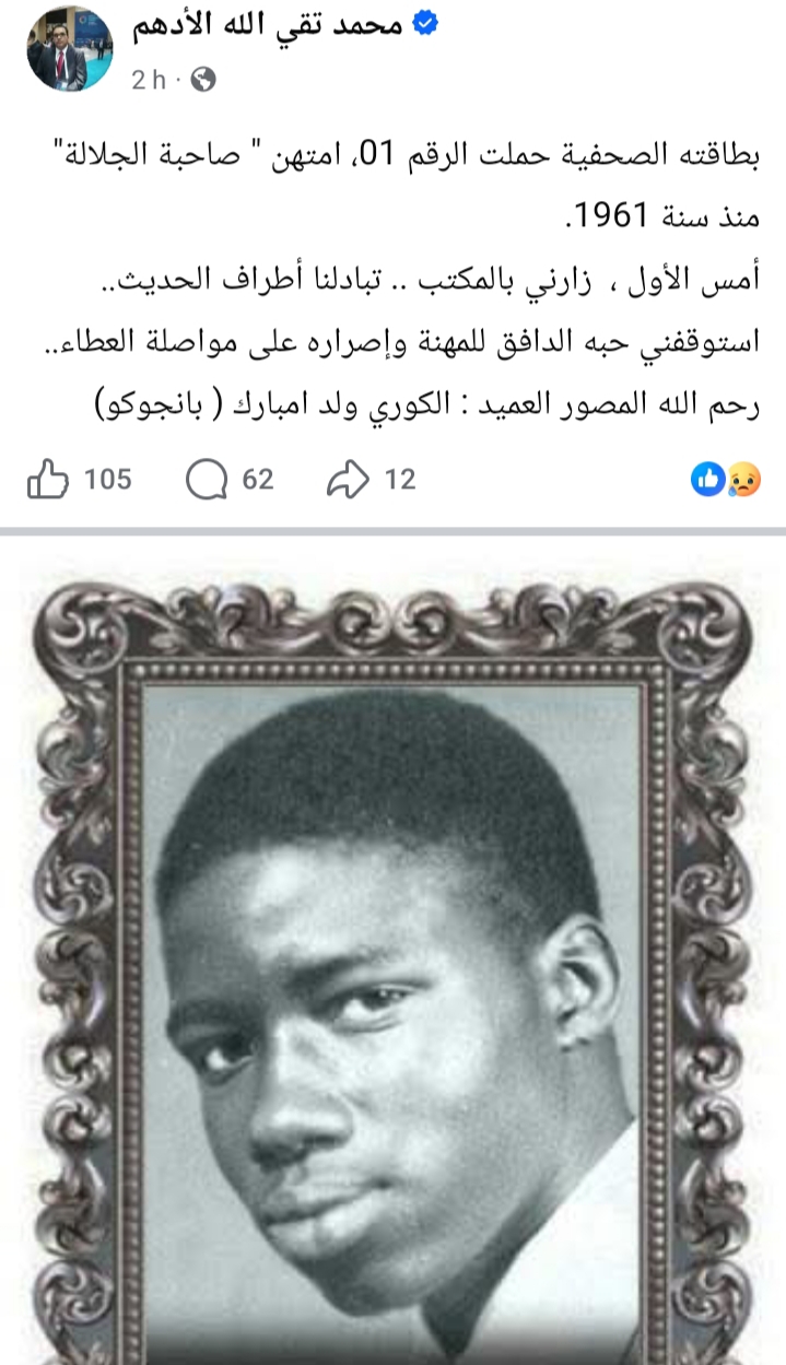 ونعى مدير الوكالة الموريتانية للأنباء، السيد تقي الله الأدهم، الراحل في تدوينة نشرها على صفحته، مشيراً إلى لقائه به قبل يومين، ومعبّراً عن إعجابه بحبه العميق للمهنة وإصراره الدائم على العطاء.