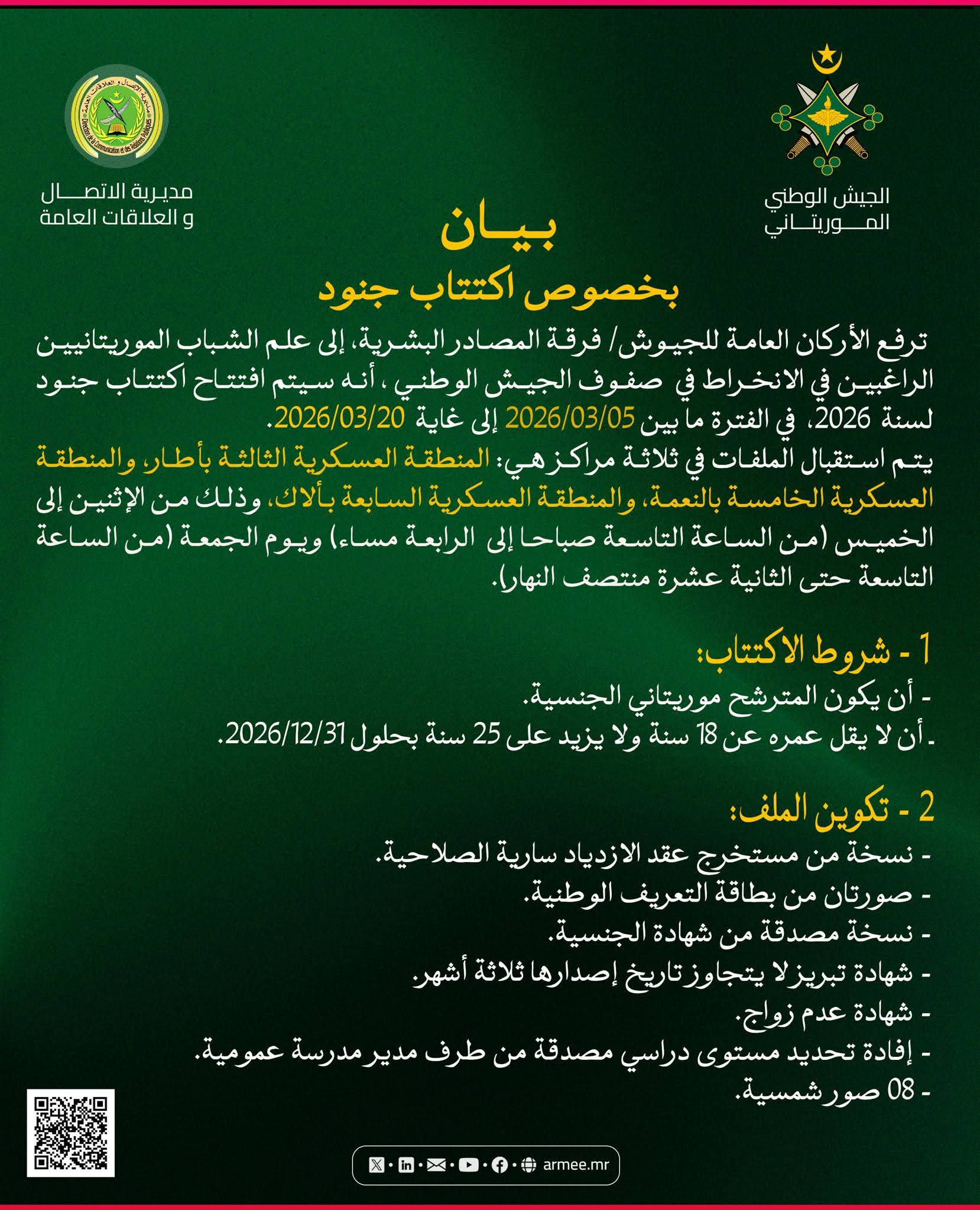 وأوضح البلاغ أن استقبال ملفات الترشح سيتم في الفترة المحددة للاكتتاب، على مستوى ثلاثة مراكز هي: المنطقة العسكرية الثالثة بأطار، والمنطقة العسكرية الخامسة بالنعمة، والمنطقة العسكرية السابعة بألاك. وستُستقبل الملفات من يوم الإثنين إلى الخميس من الساعة التاسعة صباحًا حتى الرابعة مساءً، ويوم الجمعة من الساعة التاسعة صباحًا إلى غاية الثانية عشرة زوالًا.