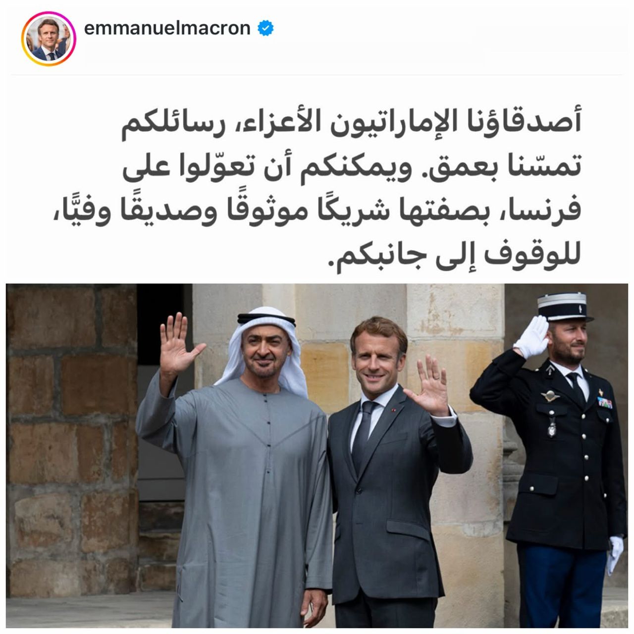 وقال ماكرون في منشور على حسابه في "إنستغرام": "أصدقاؤنا الإماراتيون الأعزاء، رسائلكم تمسّنا بعمق. ويمكنكم أن تعوّلوا على فرنسا، بصفتها شريكا موثوقا وصديقا وفيا، للوقوف إلى جانبكم".
