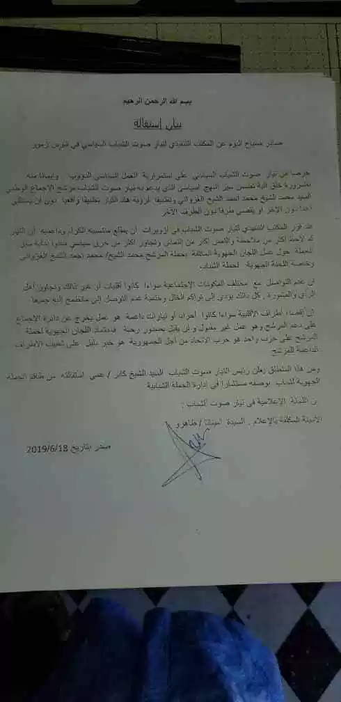 وجاءت الإستقالة عبر بيان صادر عن المكتب التنفيذي لتيار صوت الشباب السياسي فى تيرس، إتهموا فيه ادارة الحملة الجهوية بإقصاء احزاب الأغلبية والتيارات الداعمة لمرشح الإجماع ، وفهو ما يخالف نهج المترشح وتوصياته حسب البيان