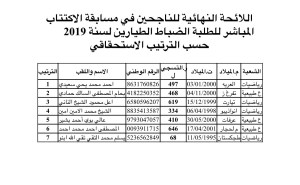 ترفع الأركان العامة للجيوش /المكتب الثالث إلى علم الشباب الموريتانيين، المشاركين في مسابقة الاكتتاب المباشر للطلبة الضباط الطيارين لسنة 2019 أن نتائج المسابقة جاءت على النحو المبين في الجدول أدناه.