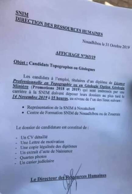 الوئام الوطني ـ أعلنت الشركة الوطنية للصناعة والمناجم "اسنيم" عن مسابقة اكتتاب لصالح حاملي شهادة" "ليصانص" في الجولوجيا و التوبو جراف Topo Graphic
